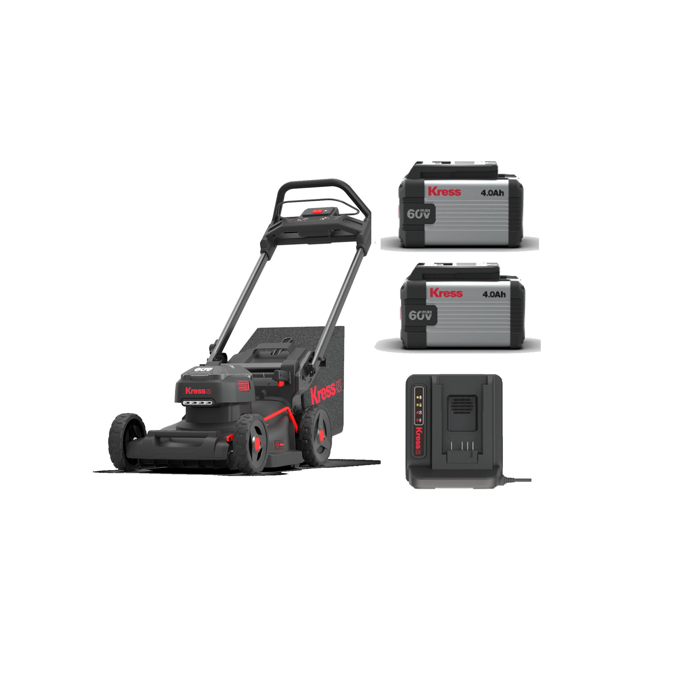 Promotional bundle featuring the KG756 43cm 60v Hand Propelled lawnmower, 2 x KA3002 4ah 60v batteries and a KA3714 Charger.